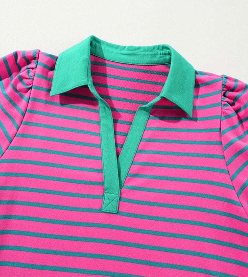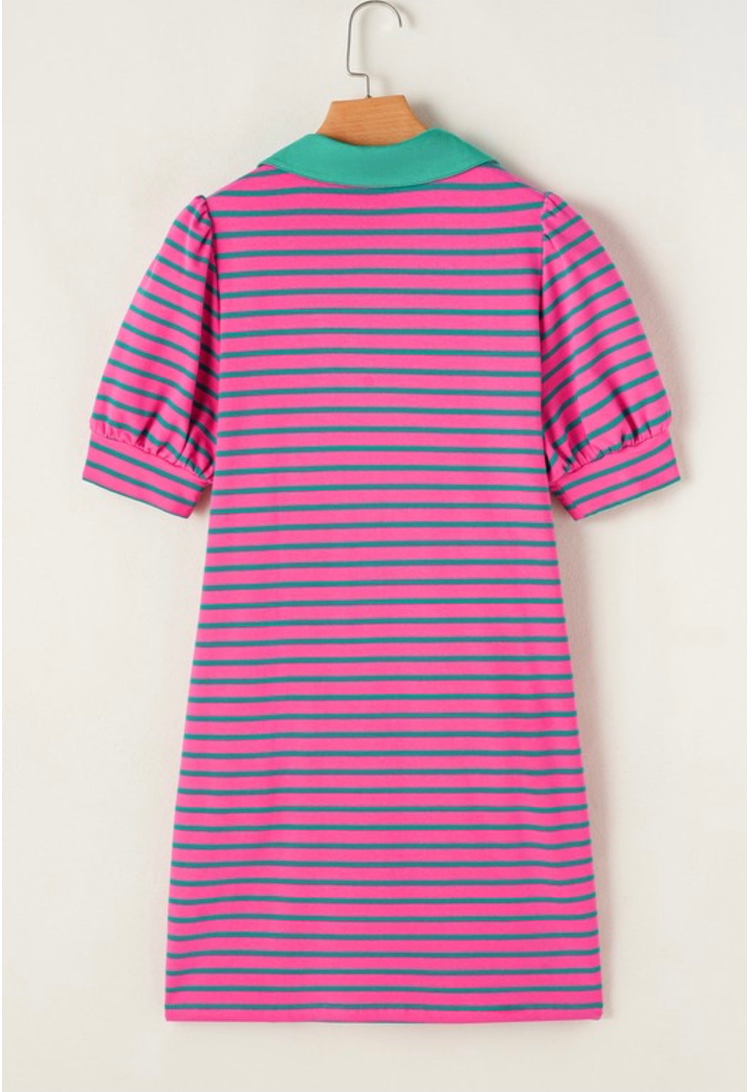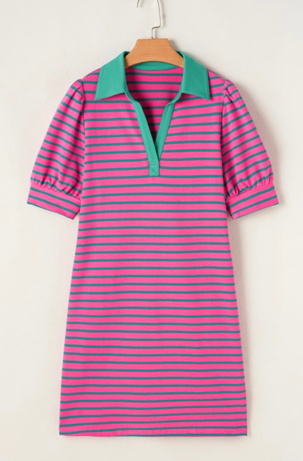 Striped Collared V-Neck Puffed Sleeve Tee Dress
