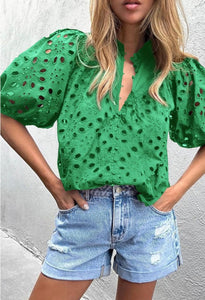 Green Hollowed Out Puffed Sleeve Blouse